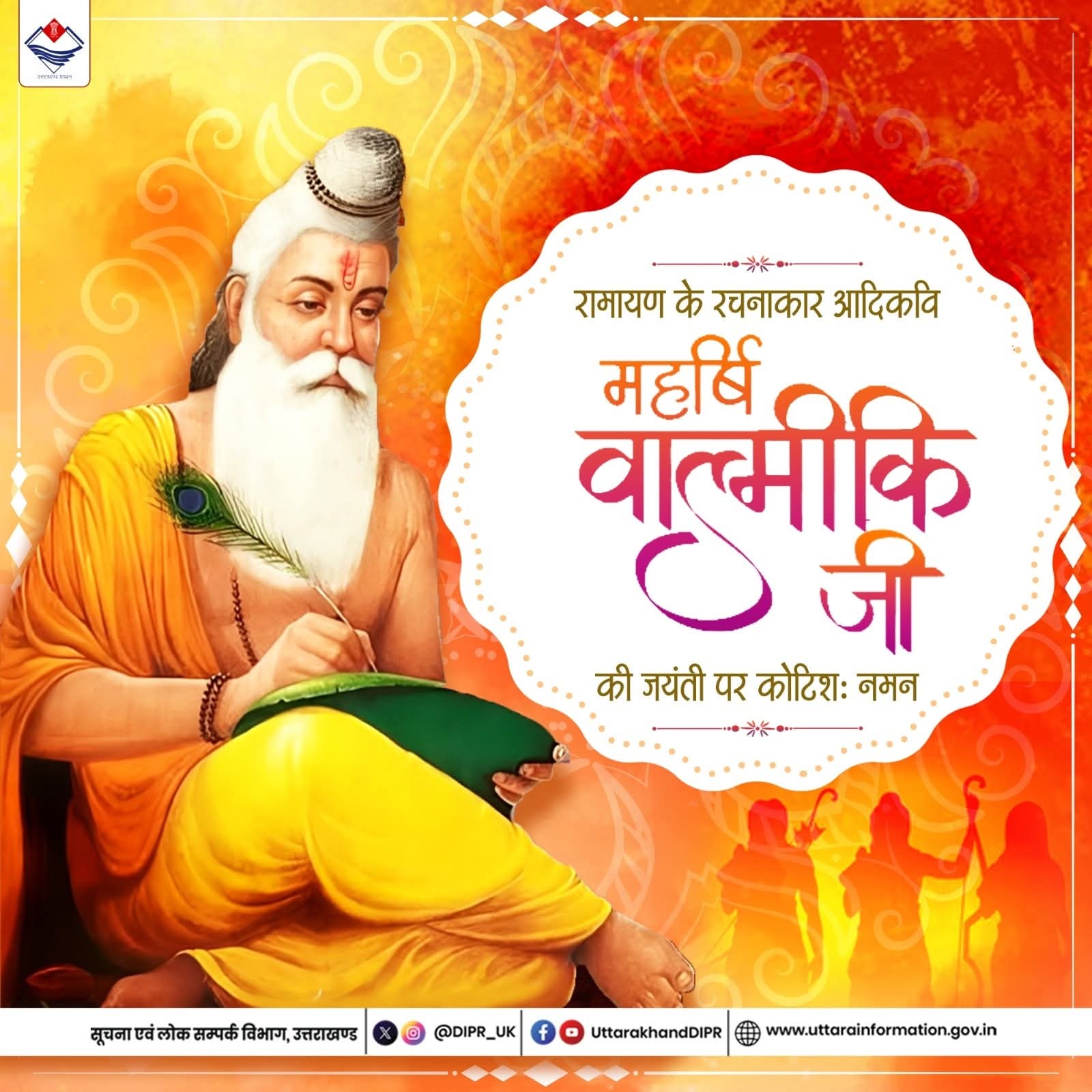 आदिकवि महर्षि वाल्मीकि जी की जयंती पर उन्हें कोटि-कोटि नमन CM Dehradun Latest News Politics special news special report Uttarakhand October 7, 2025October 7, 2025markettadkaLeave a Comment on आदिकवि महर्षि वाल्मीकि जी की जयंती पर उन्हें कोटि-कोटि नमन महाकाव्य रामायण के माध्यम से मर्यादा पुरुषोत्तम प्रभु श्रीराम के पावन जीवन चरित्र एवं आदर्शों को सम्पूर्ण संसार तक पहुंचाने वाले आदिकवि महर्षि वाल्मीकि जी की जयंती पर उन्हें कोटि-कोटि नमन। ValmikiJayanti