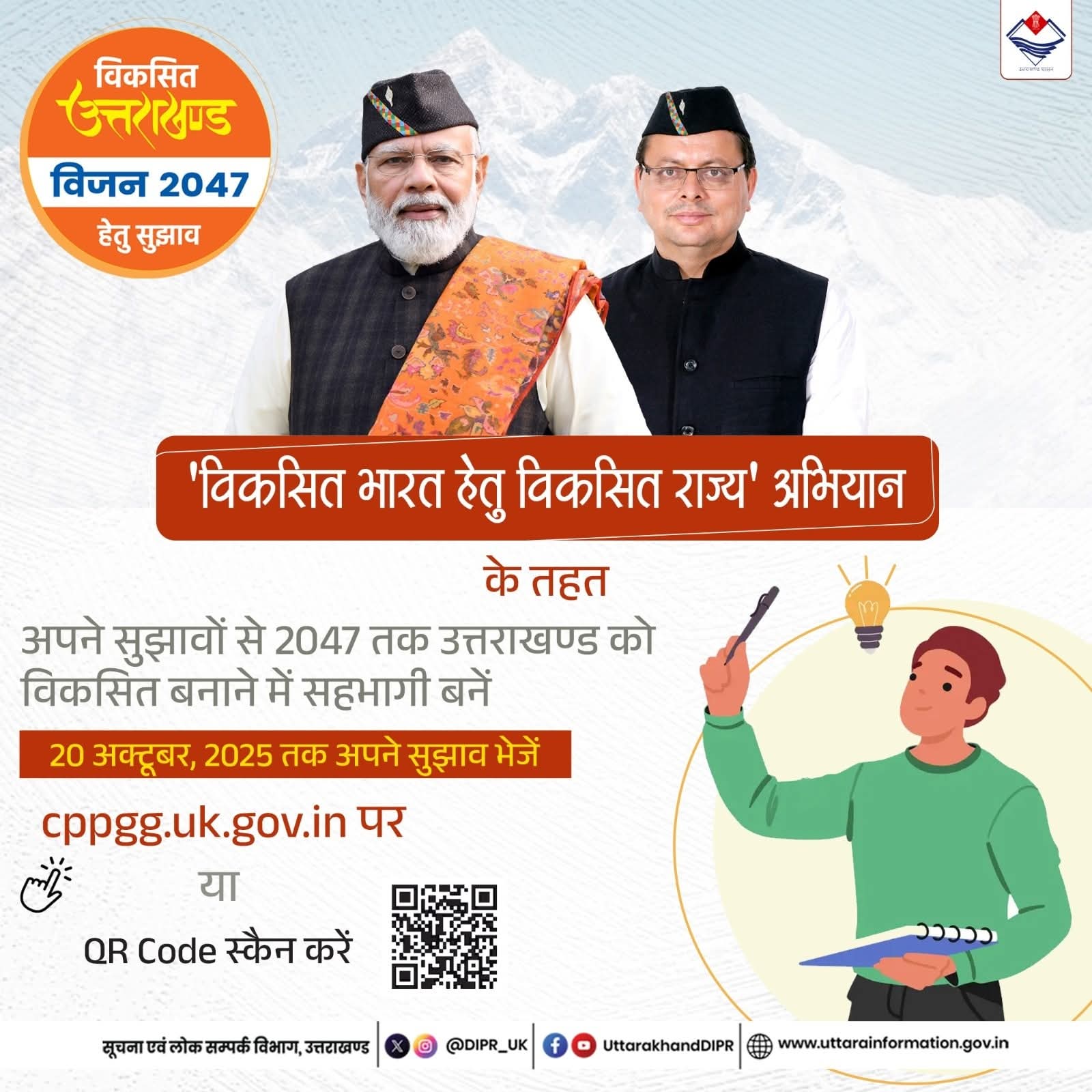 विकसित उत्तराखण्ड विज़न 2047 CM Dehradun Latest News Politics special news special report Uttarakhand October 7, 2025October 7, 2025markettadkaLeave a Comment on विकसित उत्तराखण्ड विज़न 2047 विकसित उत्तराखण्ड विज़न 2047 2047 तक उत्तराखण्ड को समृद्ध, सशक्त और आत्मनिर्भर राज्य बनाने के लिए अपने मूल्यवान सुझाव साझा करें। ViksitUttarakhand2047 DevelopedUttarakhand Vision2047 UttarakhandProgress SmartUttarakhand