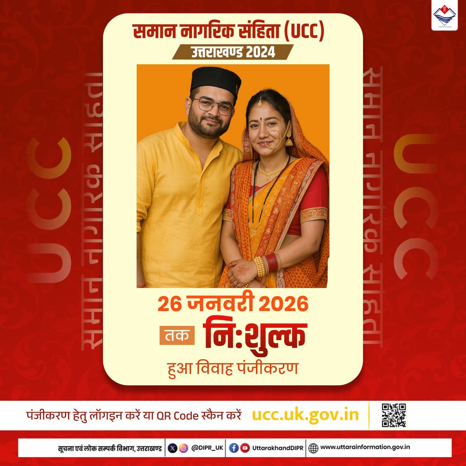 26 जनवरी 2026 तक नि:शुल्क हुआ विवाह पंजीकरण CM Dehradun Latest News Politics special news special report Uttarakhand August 18, 2025August 18, 2025markettadkaLeave a Comment on 26 जनवरी 2026 तक नि:शुल्क हुआ विवाह पंजीकरण समान नागरिक संहिता (UCC) उत्तराखण्ड 2024 के अंतर्गत 26 जनवरी 2026 तक नि:शुल्क हुआ विवाह पंजीकरण UCC UniformCivilCode समाननागरिकसंहिता FreeMarriageRegistration Uttarakhand