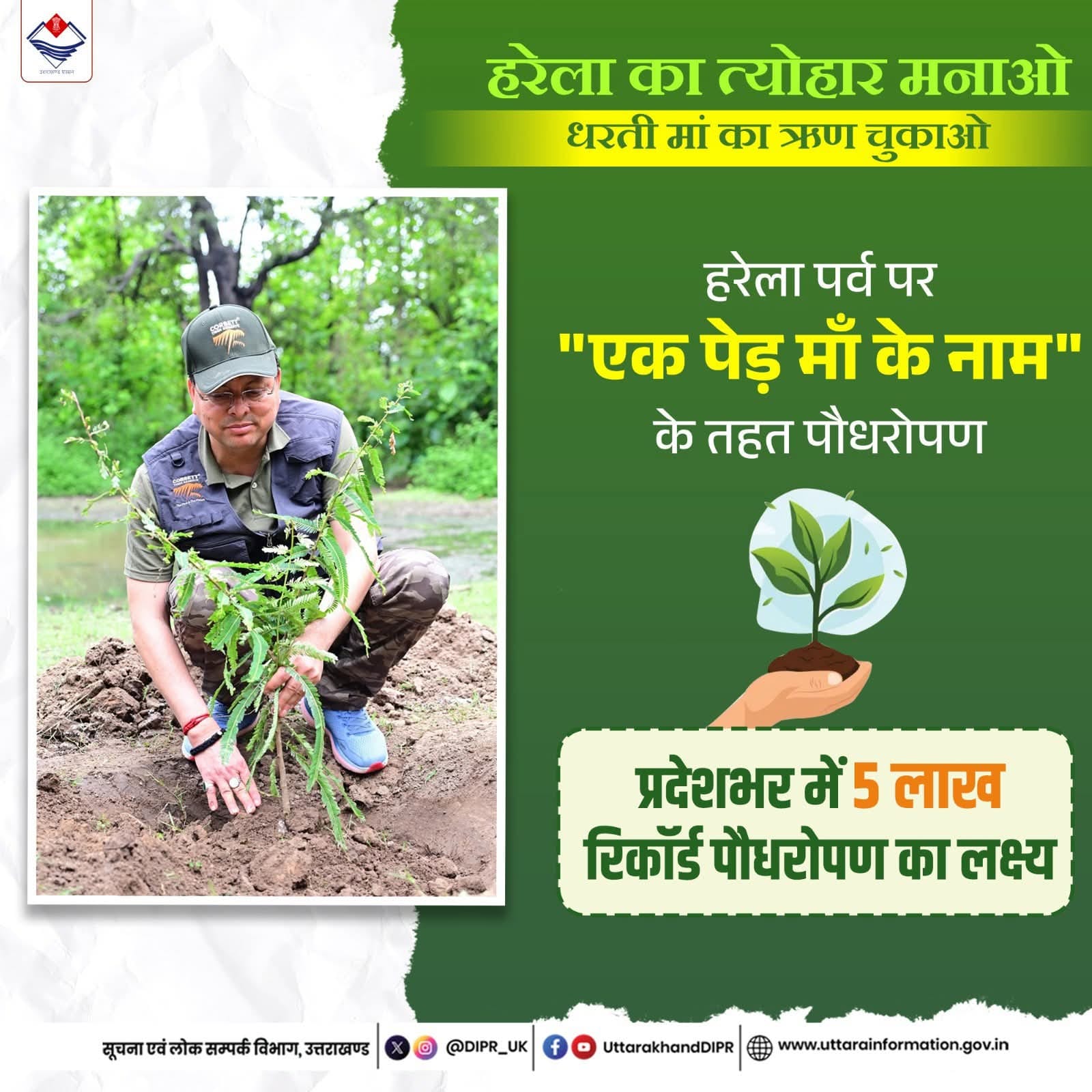 5 लाख पौधरोपण का रिकॉर्ड लक्ष्य CM Latest News special news special report July 13, 2025July 13, 2025markettadkaLeave a Comment on 5 लाख पौधरोपण का रिकॉर्ड लक्ष्य मुख्यमंत्री श्री पुष्कर सिंह धामी के निर्देश पर हरेला पर्व पर “एक पेड़ मां के नाम” के तहत प्रदेशभर में 5 लाख पौधरोपण का रिकॉर्ड लक्ष्य